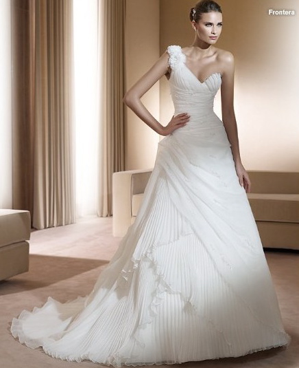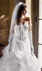 Take this dress of example. (It was removed from the David’s Bridal website and so the picture quality is… well you can see.) The corset is lovely and the pick-up skirt looks soft for once instead of ridculously poofy, and I don’t think it would be difficult to morph it into modesty.