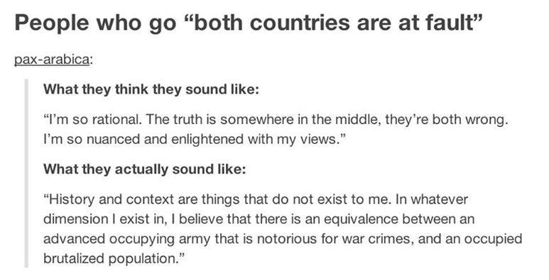 They are not saying that because they value innocent Palestinian lives over innocent Israeli lives. They are saying that because (Israeli) soldiers are not innocent whereas (Palestinian) civilians are. When you form a militia in a country that isn’t yours in order to wipe out their indigenous population, you are an occupier, not an innocent bystander. Say what you will about how messed up it is, but soldiers are meant to die in wars; they are targeted by the enemy because they are soldiers, and not civilians (unless of course your enemy is Israel, in which case all Palestinians are fair game.) Soldiers are either aggressors or resisters, but they become involved in war to kill each other. That’s how war is designed. Citing the skewed numbers between (few) Israeli soldiers and (several) Palestinian civilians is always meant to show whom each group is targeting. Its meant to demonstrate that Palestine is targeting only soldiers while Israel, continuing its heinous commits war crimes, targets civilians. It’s a clear indication that Israel’s goal is to wipe out the Palestinian population.