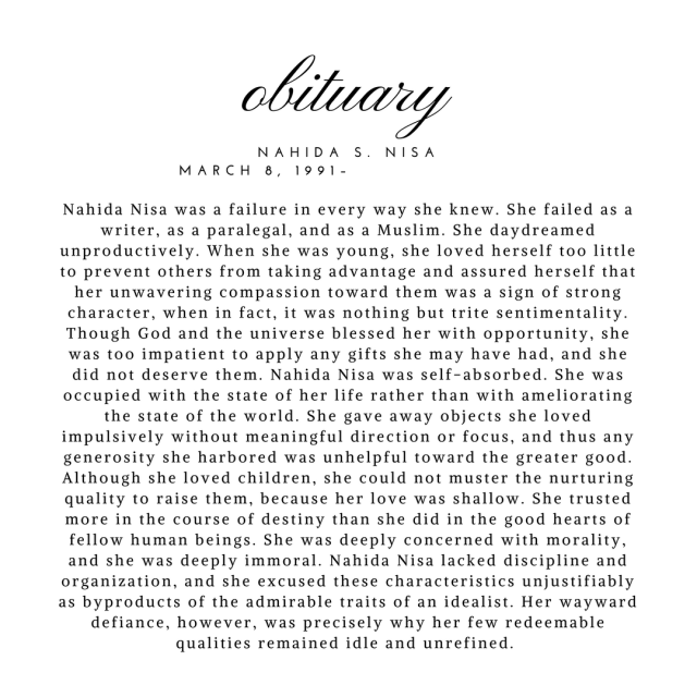 One day I wrote my own obituary with having imagined that I accomplished nothing in order to confront my worst truths about myself and, subsequently, to relieve myself of them, and you all have to promise that when I die you’ll print it. (Click twice to enlarge.)