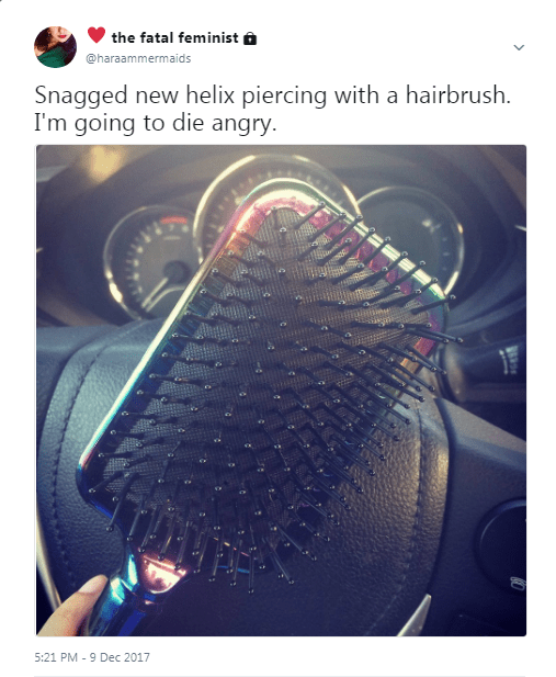 This amazement toward my body and its failings (I am being overdramatic of course) was still all before snagging my helix on a hairbrush. Behold my pierced cartilage: